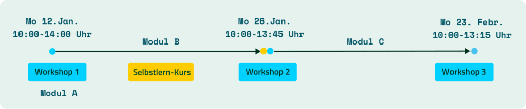 Für den optimalen Lernerfolg ist es nötig, sich zwischen den Workshops ca. einen halben Tag Zeit zu nehmen, um die Inhalte mithilfe von Hausaufgaben und Lerngruppen in die eigene Praxis zu übertragen.